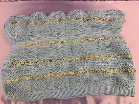 Light blue, adult afghan measuring 52" X 39". Washing instructions attached.