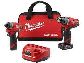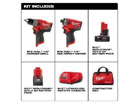 Milwaukee 2598-22 M12 FUEL? 2-Tool Combo Kit: 1/2" Hammer Drill and 1/4" Hex Impact Driver The 2598-22 M12 FUEL 2-Tool Combo Kit is the Most Capable and Most Compact 12-Volt Hammer Drill Driver and Impact Driver Combo Kit on the market. Included is the M12 FUEL Hammer Drill Driver (2504-20), the Most Capable, Lightest Weight and Most Compact 12-Volt Hammer Drill Driver in the market. At only 6.6 and 2.8 lbs. of weight it is the best Hammer Drill Driver to use in compact spaces. It delivers the power to do a wide variety of applications at 1700 RPMs and 350 in./lbs. of torque. Also included, the M12 FUEL Hex Impact (2553-20), the Fastest Driving Speed, Most Compact with 4- Mode Drive Control Impact Driver in the market. At 3,300 RPM the impact drives screws over 20% faster than competitors. At 5.1 in. L it allows for unmatched access in tight spaces. The 4-Mode DRIVE CONTROL provides greater control over output speed and power for greater versatility by delivering 0-1,300 RPM in Mode 1, 0-2,400 RPM in Mode 2 and 0-3,300 RPM in Mode 3. Mode 4 is Self-Tapping Screw Mode which is designed to reduce walking when starting self-tapping screws as well as reduce overdriving, breaking and stripping out screws. Includes: (1) M12 FUEL? 1/2" Hammer Drill(2504-20) (1) M12 FUEL? 1/4" Hex Impact Driver (Tool Only)(2553-20) (1) M12? REDLITHIUM? CP2.0 Battery(48-11-2420) (1) M12? REDLITHIUM? XC 4.0 Extended Capacity Battery Pack(48-11-2440) (2) Belt Clip (1) Contractor Bag