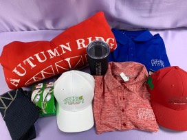Autumn Ridge basket including a variety of Autumn Ridge gear: 54x84 sweatshirt blanket, tumbler, Mens XXL blue polo, Womens M red polo, golf towel, 2 hats, and 2 sleeves of Srixon golf balls.
