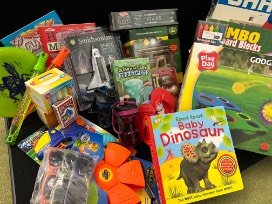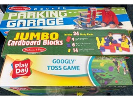 Wooden parking garage, outdoor toss game, jumbo cardboard blocks, tractor painting kit, pick-up sticks and many more outdoor activities