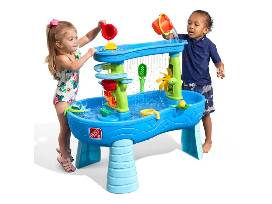 This two-tier water table makes a big splash; just pour water into the top waterfall tray to make it rain. Two rows of rainfall showers activate the large spinner on one side and flows down water slide trays into a teeter-totter on the other.