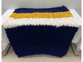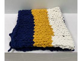 Cozy up with this handmade navy, gold, and white chunky knit blanket!