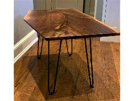 Hand-made with love by BHMS Trustee and Alum Parent Nick Pelliccione! Black walnut slab sourced from Pennsylvania, this slab was air-dried for a number of years as a rough sawn slab in my basement. Surfaces were planed flat to one and a quarter inch thickness. Overall dimensions are approximately 18 - 20" (w) x 36" (l) x 18" (h). A large natural crevice was filled with epoxy resin dyed brown with bronze metallic powder added. All non-natural edges were chamfered to soften the edge profile. Finish is Rubio Monocoat natural, a wax/oil blend, with a final coat of paste wax. The legs are from DIY Hairpin Legs, steel, powder coated matte black finish.