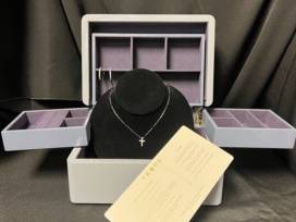 Enjoy this beautiful diamond Cross necklace (14k white gold, 0.10 ctrs diamond, 16 inch chain length). You can pair it with these stunning oval hoop Diamond Earrings - (1 ct. t.w., 14k white gold), and then store this exquisite jewelry and all of your precious pieces in this unique Trove Jewelry Box. Taking inspiration from antique jewelry boxes, and painstakingly crafted by hand, each Trove piece is a contemporary take on a long forgotten art form. All Trove items are proudly designed in Melbourne, Australia. Using traditional Lacquerware methods, each piece is impeccably designed and superbly crafted. The boxes are made from wood, painted in (100% heavy metal-free) paint before receiving eight coats of clear lacquer. All boxes are lined with the highest quality suede-like material to ensure your pieces are well cared for. All hardware is brass plated and hidden magnets ensure a wonderfully smooth and easy to use experience.