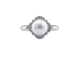 14 Karat white gold pearl ring. Made with .15 carats of diamonds totaling 16 stones. Size 6.5.