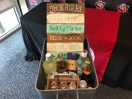 This Pottery Barn Bar Cart is filled with Orange Smashes, Champagne, Bacardi, Home Decor, a sand cloud towel & a new beer caddy.