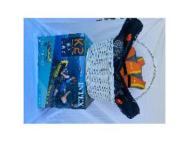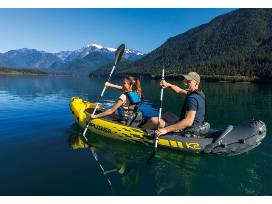 The Intex Explorer? K2 Kayak is sporty and fun with a streamlined design for easy paddling. The bright yellow color and sporty graphics makes the kayak highly visible in the water. Great for experiencing lakes and mild rivers with a friend, this Sports Series kayak is perfect for two adults. Lightweight and compact, this kayak is a snap to assemble, and allows you to take the fun of kayaking wherever you go. Made with rugged vinyl construction, this sturdy kayak has an inflatable I-beam floor for comfort and rigidity. A removable skeg provides directional stability, while two adjustable, inflatable seats with backrests are included for comfort. Quick inflating or deflating is a breeze with a Boston valve on each side. A grab line and grab handle at each end is provided for your convenience, as well as a U.S. Coast Guard I.D., and a repair patch kit. The Explorer? K2 Kayak provides added accessories including: two 86in aluminum oars and an Intex high-output pump for easy inflation and deflation