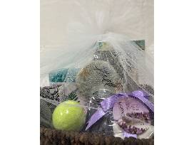 Sit back and relax with this lavender themed basket. The basket features lavender shower gel, body lotion, bubble bath, essential oil diffuser, lavender oil, bath fizzies, bean heating pad, gel packs and reed diffuser.