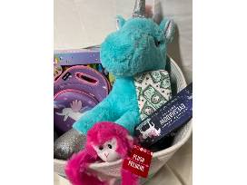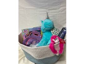 This basket is what unicorn dreams are made of! The basket includes a giant unicorn plush, monkey plush, unicorn lunchbox, manicure makeover, eyeshadow set and wallet.