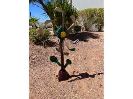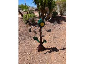 This charming windmill garden statue features unique designs of golf clubs and spoons.