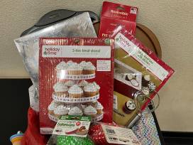 This baking set will start you off on the right foot for holiday baking. Features apron, rolling pin, and bakewear (treat stand, treat box), and baking sheets.