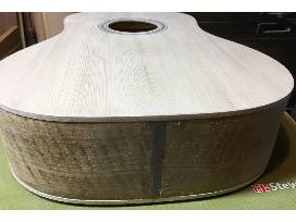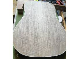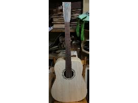 The top is Adirondack Red Spruce the back and sides are Curly White Oak. The neck is made with Maple, Cherry and Walnut. The binding is Sycamore and the wood from the Clearwater is Red Oak. The inlay is reconstituted stone that is Turquoise. Scale length is Martin 25.34" and nut width is 1 11/16").