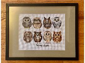 - Framed "Indiana's Eight" owl cross-stitch created by Brad Bumgardner, IAS Executive Director, during winter "COVID quarantine." Features all 8 regularly occurring Indiana owls. Framed size 12"x15".