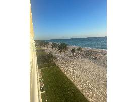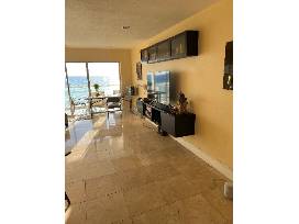- The living room is furnished with updated TV, and there's a sliding glass door to the balcony with full ocean view.
