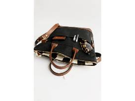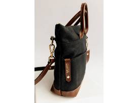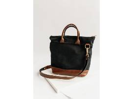 The "Otto" is a signature black canvas and brown leather handbag by R.Riveter. The bag comes with an adjustable crossbody strap and functional handles.