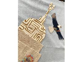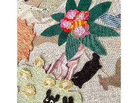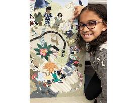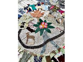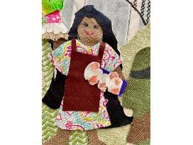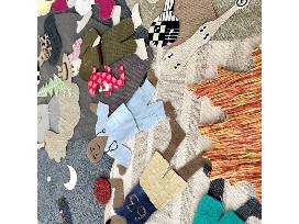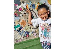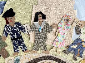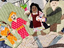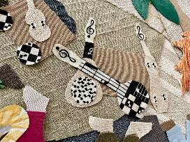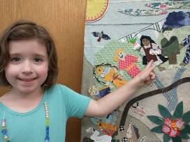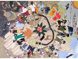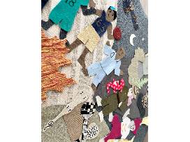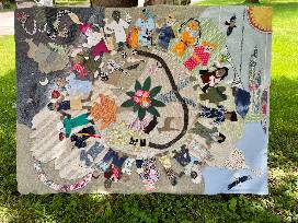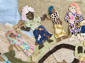 The collage was created by students in the after school program from upcycled fabric scraps, recycled trim and drawings on paper and in upholstery trimming.