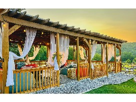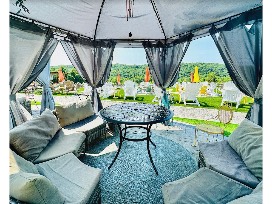 Our Fairy Gazebo seating spaces accommodate up to 9 guests and are the perfect location to gather with friends and family, sample wine flights, slushies, sangrias or bottles of wine from the vineyard's collection, while enjoying the outdoor music, magical sunset and hilltop views. Each space is shaded and decorated with a different garden theme. A heater is included.