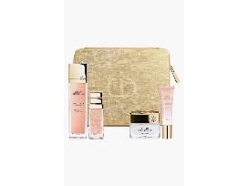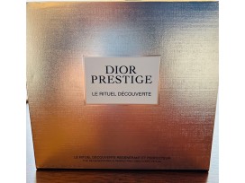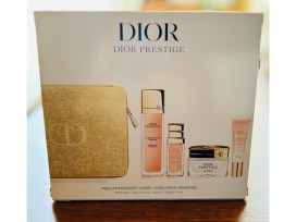 (1) Luxurious skin-care set featuring four Dior Prestige essentials housed in a golden vanity case.