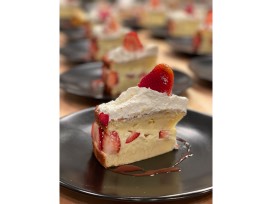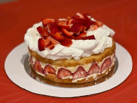 Vanilla sponge cake with homemade vanilla bean pastry cream, strawberries and a final touch of whipped cream.