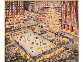 This enchanting quality of Tina's New York scenes is exactly what makes them so popular with the viewers. They have something from the classic American primitive, something sentimental and Romantic. The artist creates a magical space in place of a real city, a better fictional joyous place. There is real luminosity in it that enhances a fairy tale look. Windows are all lit, snow in the streets is pure and white, the sky above the city is filled with stars, the Grand Central is peaceful and not crowded with people rushing to get on the trains. It feels like the characters that populate Tina's scenes come from her imagination and maybe from another era, purposely to enhance her point of view. She paints truly pastoral scenes full of joy, with perfect people in the perfect world. Very often she recreates the holiday spirit of New York, with Christmas trees full of lights and people engaged in leisure activities. Sometimes, it is the summertime with bright blue sky and perfectly green grass in Central Park.