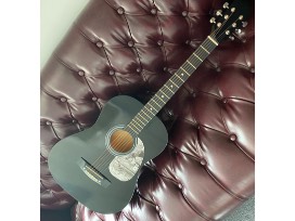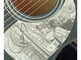 This black acoustic guitar measures approximately 38" in length and has been hand-signed (on Folklore album artwork, that has been repurposed as a pick-guard) by Taylor Swift.