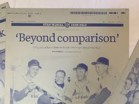 This plate is 11" wide by 24.25" tall. These are the original plates that were used by the Post-Dispatch to print the paper on January 27, 2013 for a Stan Musia lTribute