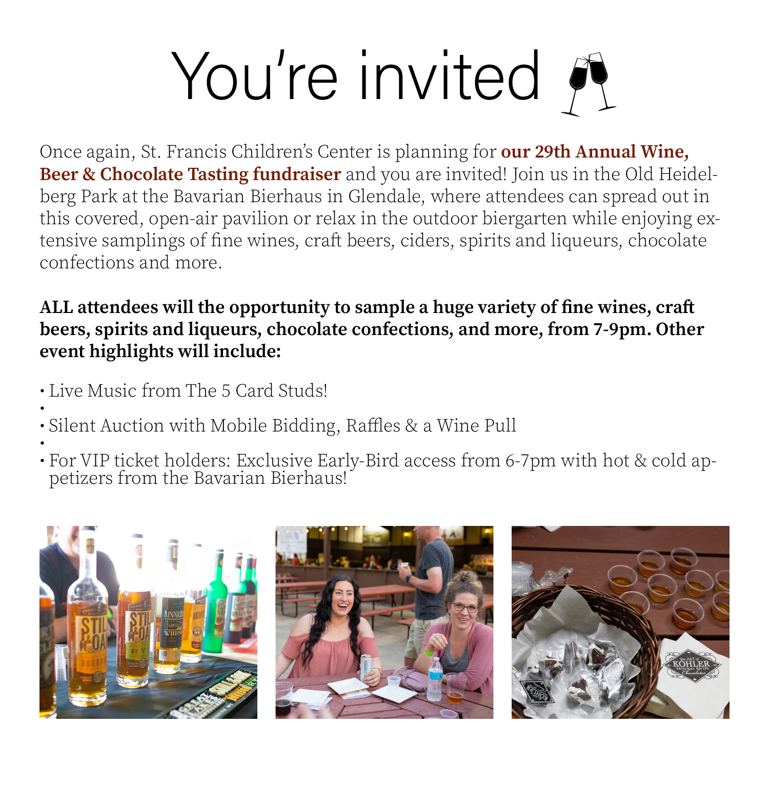 You can still participate in the auction!Tickets Sales are extended until 5 PM today for our 29th Annual Wine, Beer & Chocolate Tasting fundraiser on Saturday, May 21, 2021, at the Bavarian Bierhaus. Once closed, no tickets will be sold online! However, you can still participate in our Online Silent Auction!