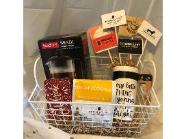Basket also includes a French Press pot, coffee beans from Noble Coffee, and a unique mug stating "Every latte thing is going to bean alright"