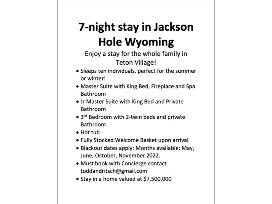 Enjoy a 7 night stay in a cottage estimated at a cost of $7,500,000. This ski cottage is in the Teton Village and perfect for a summer or winter get away with the family. Sleeps up to ten people. With many amenities to your liking, with spas, welcome baskets, hot tubs, outdoor dining and grilling. Spend a week relaxing in the mountains!