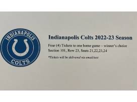 Support our Indianapolis Colts and enjoy some fun at one home game of your choice for the 2022-23 season! Four (4) tickets, Section 101, Row 23, Seats 21, 22, 23, 24. These seats are on the aisle and offer quick access to food, beverages, and restrooms!