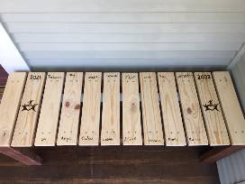 After a long day of school or work, you deserve some time to sit on this one-of-a-kind outdoor bench. Lovingly made by WO parents, this bench was built with sturdy western wood lumber and topped with whitewood boards, both wood types that can withstand the outdoor elements. Jennifer and her 3rd grade students hand wrote their names on the bench top, and those names and WO logo are permanently wood burned, serving as a memory of this special school year. The beautiful two toned bench is finished with a protective sealant and measures approximately 47.5 inches long x 16 inches wide x 18 inches tall.