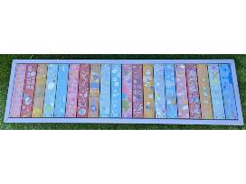 This 75.5" x 21.5" indoor/outdoor redwood bench would be a perfect addition to your garden, deck, or patio! Painted in a cheery rainbow color scheme and decorated by each of the artists in Room 4, this bench will be sure to bring a smile to your face every time you sit on it to enjoy your morning coffee or evening glass of wine.