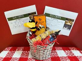 Asheville Bee Charmer basket including Bee Charmer ornament, Bee Hugging Rainbow Lollipop, six pack of honey tee lights, Firecracker Hot Honey, Rosemary Lemon Body Butter and jar of Wildflower Honey.