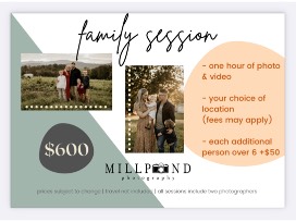 Millpond photography is a professional photography and videography team based in Staunton, Virginia. Jonathan and Samantha Shover are a husband and wife team, and they are well known locally for their premier photography! Enjoy a family session that includes 1 hour of photos & video at your choice of location locally, for up to 6 people. This would make a wonderful gift, or you can use this session for your family and enjoy capturing happy memories for many years to come through a collection of beautiful and moving photos!