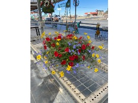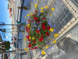 Blue hanging basket with various blooming plants