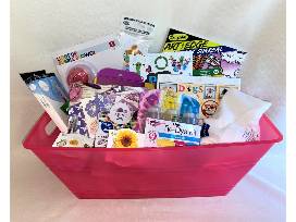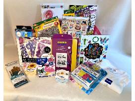 More summer fun! "Get Surreal" Coloring book and colored pencils, Watercolor resist pad, 12 tubes of watercolor and brush set, Paint Your Own Suncatcher kit, Fuse Bead keychain kit, Hand Lettering set with pencils and markers, Dog Days jigsaw puzzle, Tie-Dye kit and cotton t-shirt, Daisy & Sunflower grow kits for summer flowers, Make Plastic Fantastic Recycling project book, Light-up Bubble blower. Packaged in a plastic party tub.