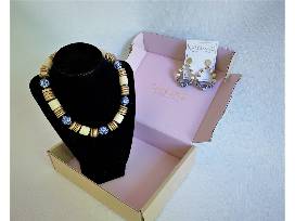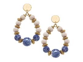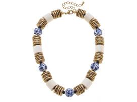 1This necklace and earring set featuring Chinoiserie & Painted Wood beads will steal the show! Worn gold discs strung together with painted wood & blue & white porcelain beads offer chic, statement-making style. The necklace is 16" long with an adjustable chain closure. The earrings are 2.5" long.