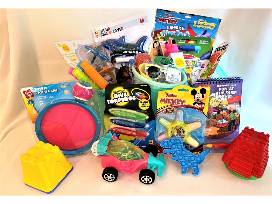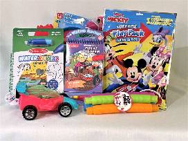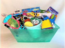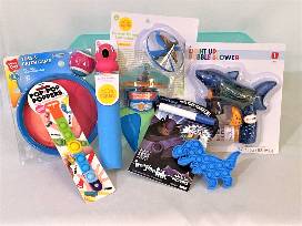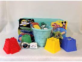Toys and activities for younger kids, packaged in a plastic party tub. Includes Mickey Mouse Surprise Play Pack, Flashing Racer with pull string, Dive Torpedos, Critter Blaster (squirts water up to 25 feet), Beach Pail with sand toys, Sand Molds, Light-up Bubble Blower, Sidewalk Chalk Wheel, Pop Tubes and Toys, Power Copter Launcher, Water Reveal art pads, Catch & Play game, Kids Sunglasses.
