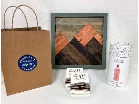 Peddler's Paradise in downtown Monroe has merchandise from 60 local vendors plus other unique items. This package includes a 10 X 10 wooden plaque "Geo Mountains," a Brumate Hopsulator Twist stainless steel can cooler designed for 16 oz aluminum cans, and 2 Griff's coffee toffee bars.