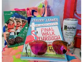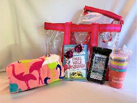 This package features a clear vinyl beach bag with plenty of room for lots of beach essentials. The bag measures 20" wide by 14" high with a flat bottom that is 6" wide. The bag includes a zippered pouch for small items. Also included with the bag is an oversized beach towel (36" X 72"), 3 cans of adult beverages (Tanqueray Gin & Tonic, Capriccio Sangria, & Ketel One Peach & Orange Blossom Vodka Spritz), GS Thin Mint Cookies, Swell insulated stainless steel drink bottle, 6 reusable party cups with lids, a waterproof cell phone pouch, "Final Walk Through" by CeeCee James (great beach read), and a pair of Sumato cat-eye sunglasses with mirrored polarized lenses