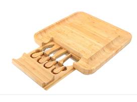 Serve cheese, crackers, and veggies on this lovely bamboo board with slide-out utensil tray (4 piece knife set included). The board measures 13" X 13" and features a groove around the edge for crackers or vegetables. It is resistant to heat, odor, and stains, and can be wiped clean with a damp cloth or hand washed in soapy water. Also included in this package is a set of 4 unbreakable wine glasses, plastic snack plates and napkins, "Sweet Dreams are Made of Cheese" towel, and a book about preparing and serving cheese boards "That Cheese Plate Will Change Your Life."