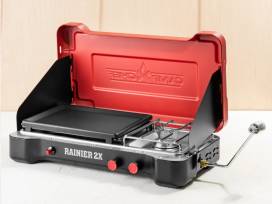 There's nothing better than a cool, crisp morning in the outdoors with a pile of steaming bacon, eggs, and pancakes. And there's no better camp system to create that meal than the Rainier 2X Combo. With the included non-stick aluminum griddle, you have the space to cook up breakfast on one side and heat a kettle of water on the other. Features include: