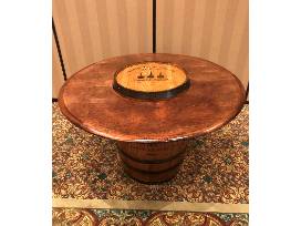 A custom-made wooden doughnut top has been added to this 53 gallon barrel to make it into a table. The diameter of the table measures approximately 52 5/8 inches.