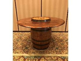 A custom-made wooden doughnut top has been added to this 53 gallon barrel to make it into a table. The diameter of the table measures approximately 52 5/8 inches.