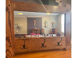 This entryway mirror is a unique addition to any home. It is a beautifully handcrafted oak mirror that is etched with Buffalo, NY and is also a sturdy coat rack. Perfect for your front hallway or main entrance. Dimensions are 32" in width and 24" in height.