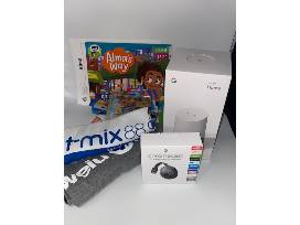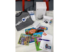 Swag bag from WEIU including a google home, google chrome cast, WEIU shirt, hit-mic shirt and other PBS items.
