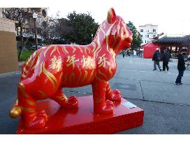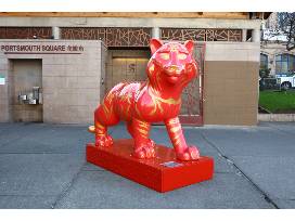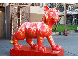 In Chinese culture, the tiger is the symbol of courage, strength, and bravery. The Wealth and Health tiger is red, a powerful color befitting the tiger, representing good fortune and joy. Gold represents wealth and prosperity. The tiger's stripes are painted in the style of Chinese calligraphy, paying homage to the ancient art. "Happy New Year" is written across the tiger's body and the symbol for double happiness is on the tiger's head. The Chinese characters are carefully positioned on the tiger to emulate the unique characteristic markings of real tigers. The tiger's stripes also flow like water representing 2022, the year of the water tiger. The year itself winds like a river around the tiger's paws creating its toes.