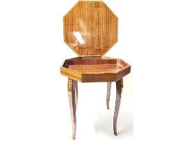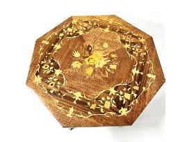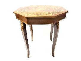 Impress your guests with a vintage music box table made of inlaid wood. This end table is about 3 feet tall with beautiful paintings on the top and legs. The top lifts up and it plays the Dr. Zhivago theme.