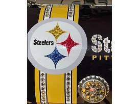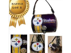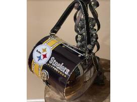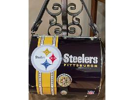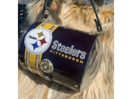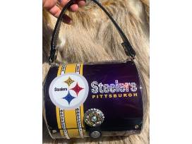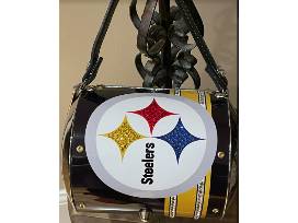 Pittsburgh Steelers bling'd out metal handbag/purse is amazing. It is one of a kind. The crystal detailing is exquisite. The purse is lined with a felt like fabric on the inside. The bottle caps are detailed in swarovski crystal.