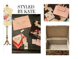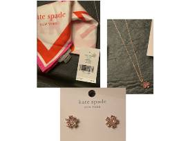 One Kate Spade Silk scarf, One pair of Kate Spade crystal earrings and crystal Kate Spade necklace, One pink leather Kate Spade Card Holder and one Trina Turk Dresser Box